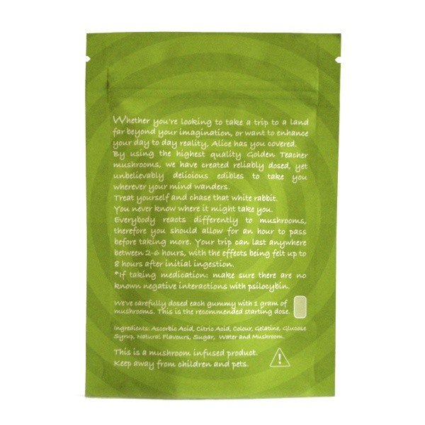“Whether you’re looking to take a trip to a land far beyond your imagination, or want to enhance your day to day reality, Alice has you covered. By using the highest quality Golden Teacher Mushrooms, we have created reliably dosed, yet unbelievably delicious edibles to take you wherever your mind wanders.