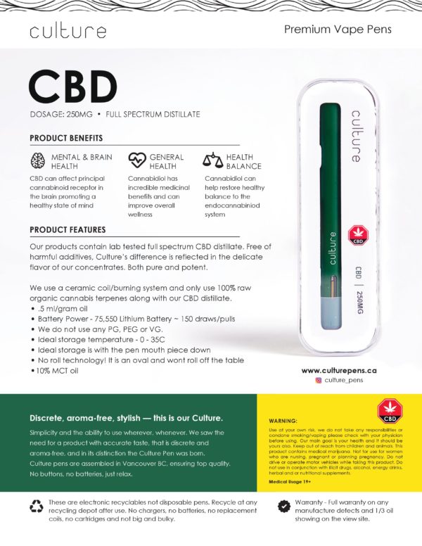 These disposable CBD vape pens from Culture come pre-loaded with 250MG of CBD Full Spectrum Distillate. This blend is extremely low THC (0.2% or less) and created with fast acting, long lasting pain relief in mind. A quick pull relieves headaches, muscle pain, and other chronic pains fast. With no THC you can go about your day with no psychoactive effects. With no battery to recharge, all you do is take a drag and enjoy. You can expect to get approx. 150 pulls from the built in Lithium Battery and Ceramic Coil & Burner. Ideal storage is at temperatures above freezing but below 35 degrees Celsius, and stored with the pen cap down to eliminate burner issues.