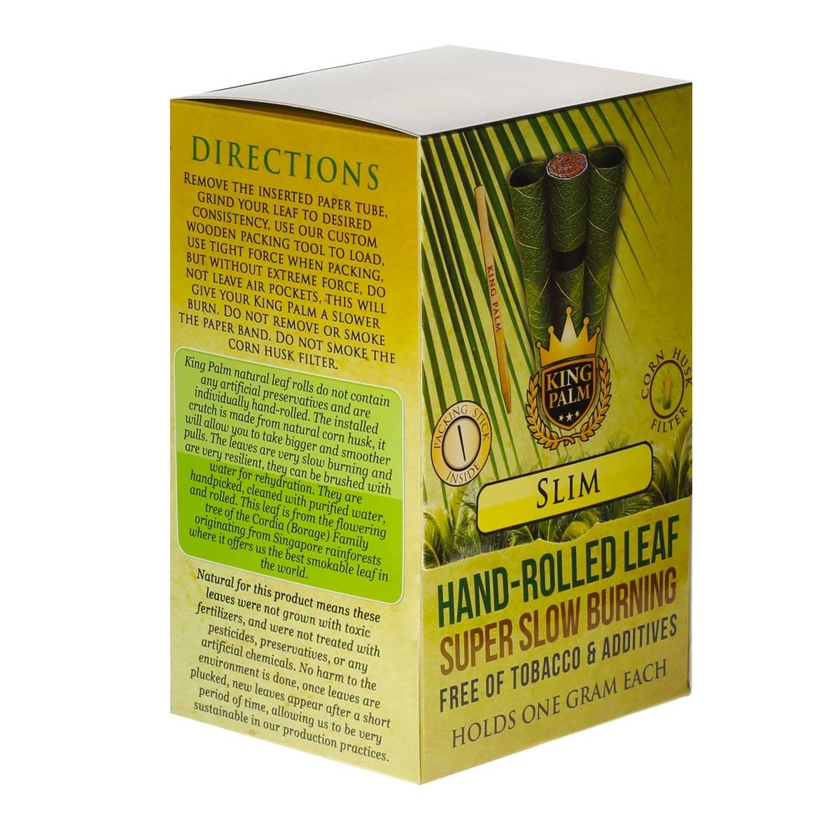King Palm produces the best slow burning natural leaf on the planet. The leaves used are handpicked from the flowering tree of the Cordia (Borage) family. Each leaf is hand rolled with a pre-installed natural corn husk filter. King Palm wraps are chemical, preservative, artificial flavor, GMO and glue free which makes them a better quality and cleaner product than other common wraps on the market.