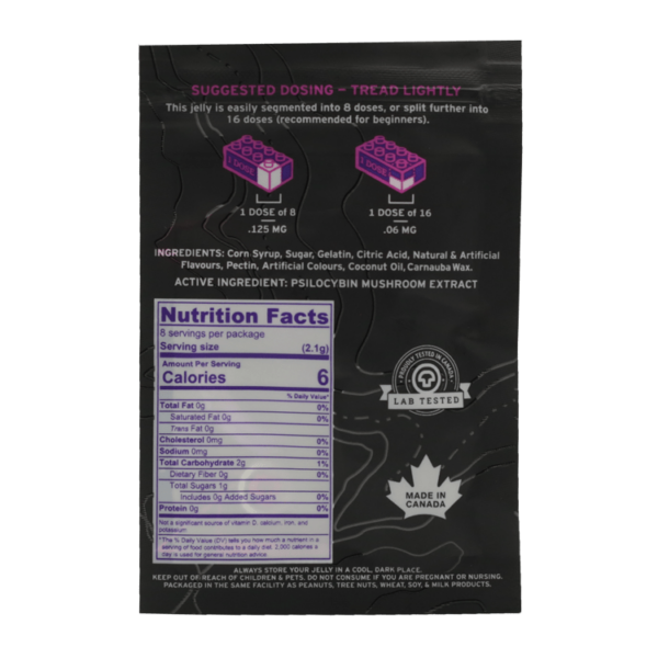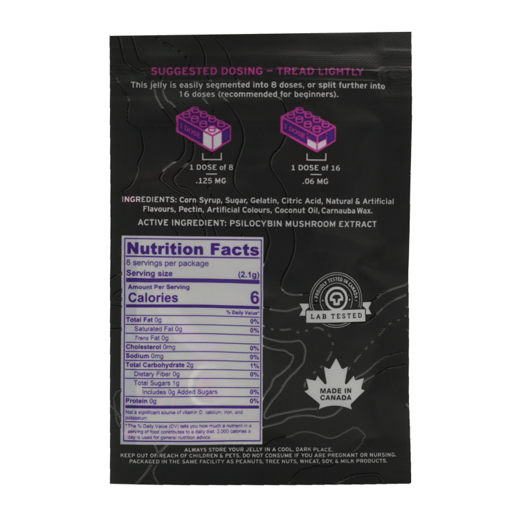 Our jellies are great for those who are new to the world of shrooms. They give you a delicious and easy way to enjoy the benefits of psilocybin mushrooms, in a consistent dose. Golden teacher mushrooms are the most popular strain out there, for their reliable trip and euphoric properties. Suggested Dosing, tread lightly. This jelly is easily segmented into 8 doses, or split further into 16 doses (recommended for beginners).