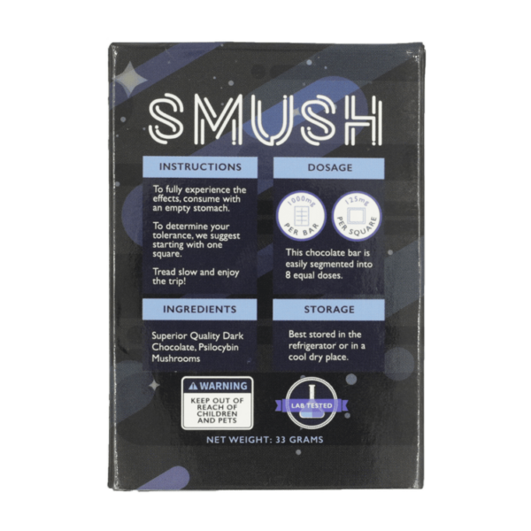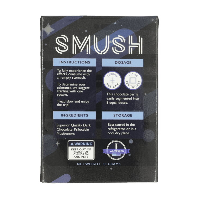 SMUSH chocolate bars come in lab precise dose segments to help you reach your desired trip experience level. One segment will be adequate for a micro-dose and five for full blown trip experience into SMUSH multiverse.