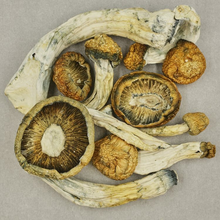 Thrasher strain. Appearance-wise, these big, beautiful mushrooms feature thick, long, and substantial pale stems that display a blue bruising when picked, indicating a high psilocybin content. The caps are relatively small and exhibit a beige hue.